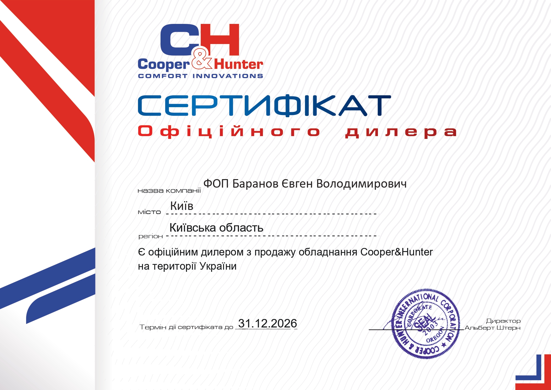 Ми здійснюємо постачання, продаж та сервісне обслуговування кліматичного обладнання цього бренду на підставі чинного сертифіката дилера, виданого компанією Cooper&Hunter International Corporation.